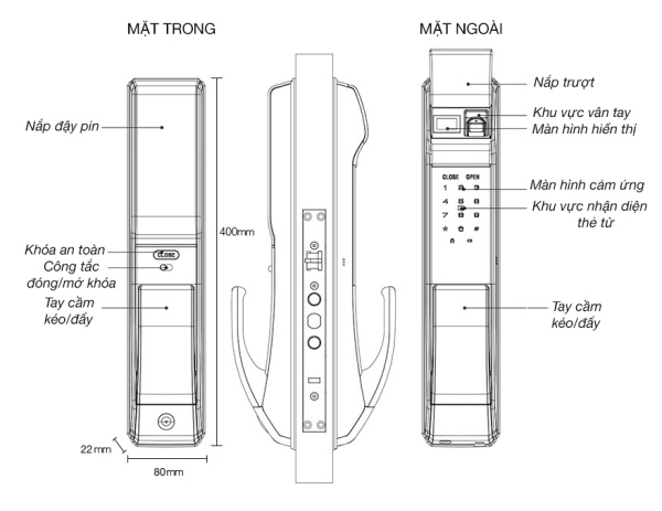 - Chốt chống làm phiền (khóa trái trong): khi ấn nút Close để chốt, khóa không thể mở được từ bên ngoài bằng vân tay, thẻ từ, mã số đã đăng ký (chỉ mở được bằng chìa cơ)