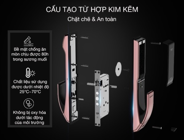 - Chất liệu thân ngoài: hợp kim kẽm, với bề mặt kính cường lực chống xước, không để lại dấu vân tay; Thân trong: hợp kim kẽm. Nên trọng lượng nặng hơn nhiều loại khóa thông thường