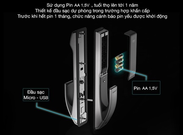 - Nguồn điện: 4 pin AA, dùng trong 1 năm; Nguồn điện khẩn cấp: sạc qua cổng micro USB (đấu bên ngoài trong trường hợp hết pin)