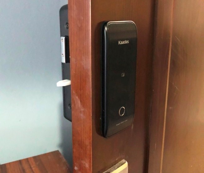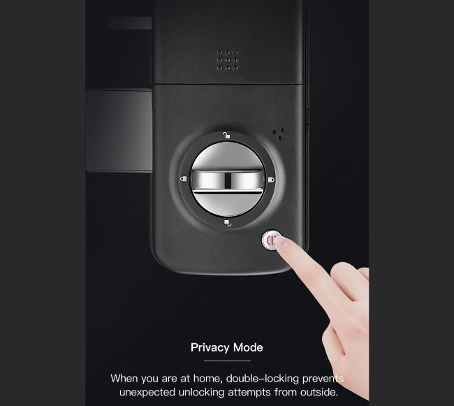 - Có chế độ riêng tư, chống làm phiền: khi cần thì ấn và giữ nút ở bên trong để để kích hoạt, khóa không thể mở được từ bên ngoài bằng vân tay, thẻ từ, mã số đã đăng kí (chỉ mở được bằng mã số chủ)