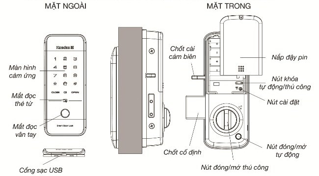 - Nguồn điện: 4 viên pin AA alkaline- pin kiềm khô, dùng trong khoảng 1 năm (khi trung bình mở 10 lần/ ngày); Nguồn điện khẩn cấp: pin sạc 5V qua cổng micro USB (đấu bên ngoài trong trường hợp hết pin)