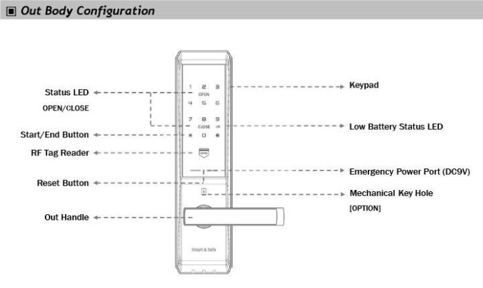 - Nguồn điện: 4 pin AA Alkaline, dùng trong khoảng 1 năm (trung bình 10 lần/ ngày); Nguồn điện khẩn cấp: pin DC9V (đấu bên ngoài trong trường hợp hết pin)