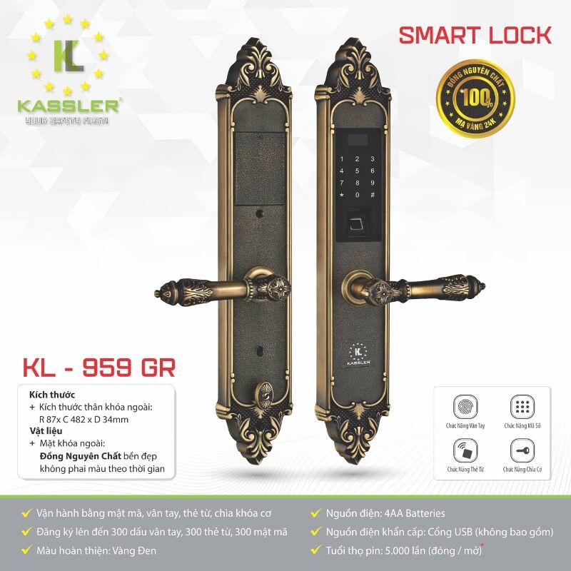Kassler KL-959 GR có toàn bộ thân khóa làm từ đồng nguyên chất không bị oxy hóa, nên màu sắc bền đẹp theo thời gian