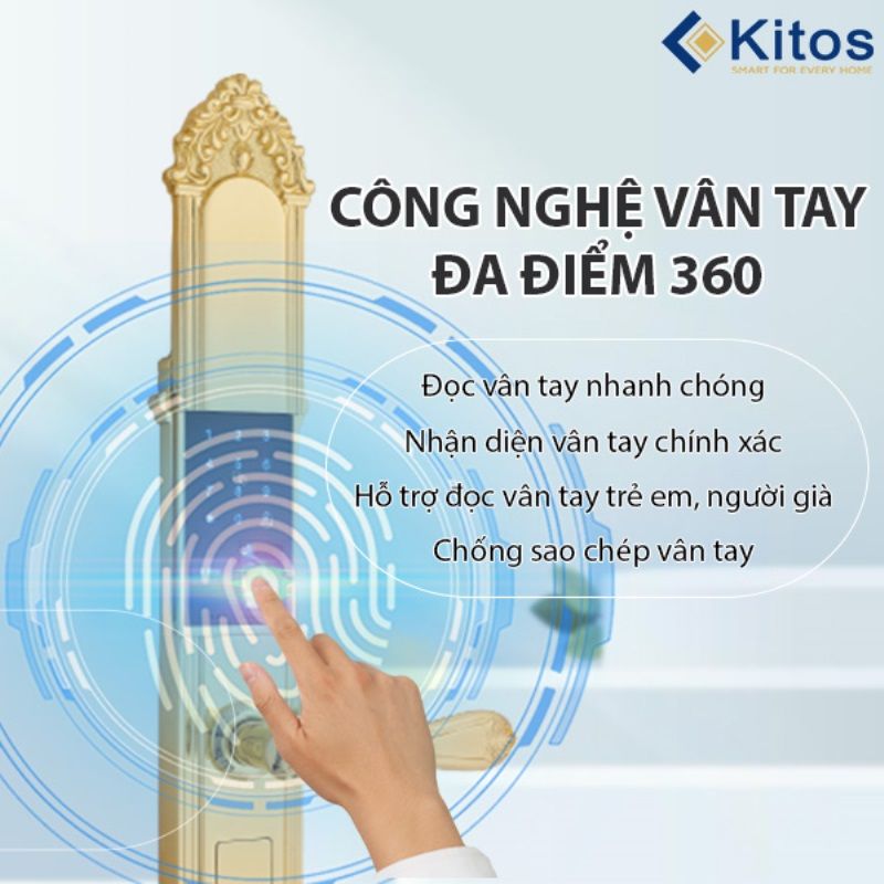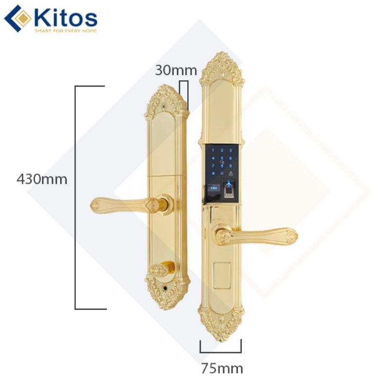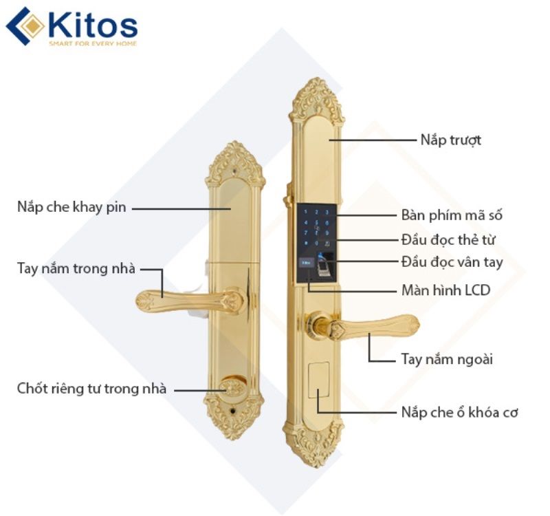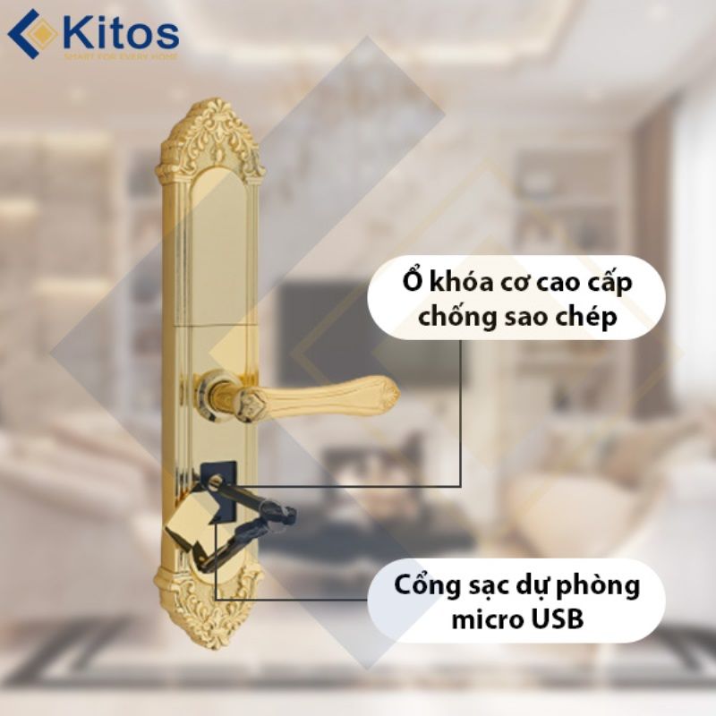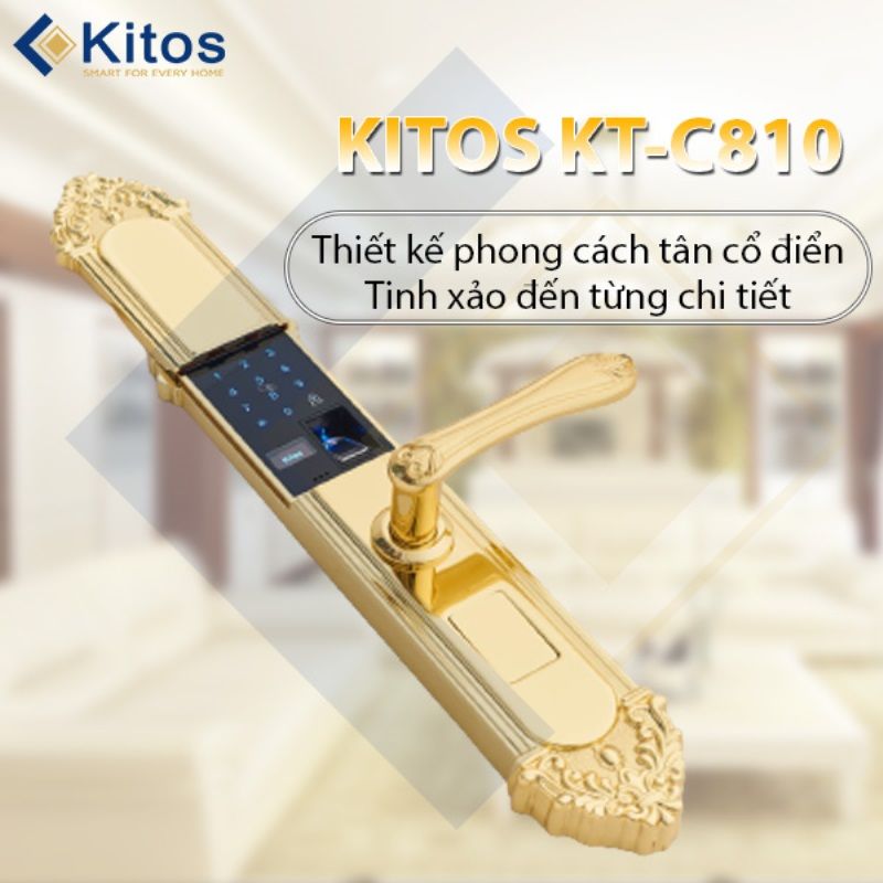 - Kitos KT-C810 Gold 24K đăng ký tối đa được 300 vân tay, thẻ từ, mã số. Có sẵn: 2 thẻ từ nhỏ, 2 chìa cơ