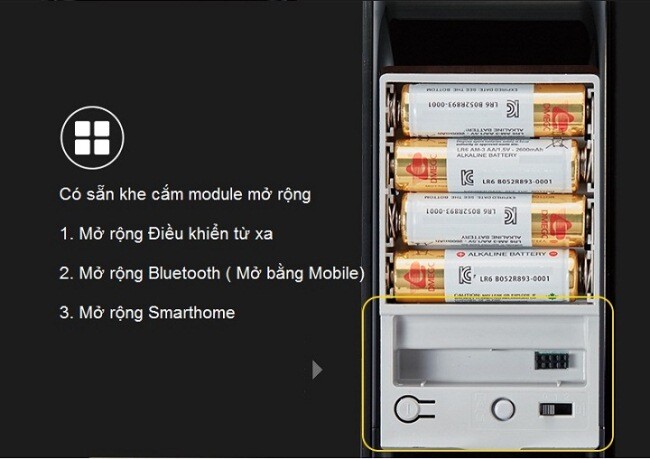 - Nguồn điện: pin kiềm khô Alkaline AA 1,5V (4 viên). Dùng trong khoảng 12 tháng (trung bình 10 lần/ngày). Nếu để hết pin thì dùng viên pin 9V DC để mở khóa