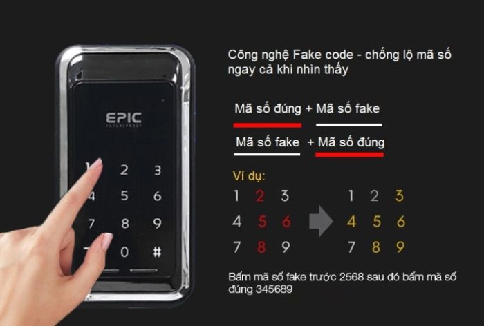 Khi sử dụng tính năng mã số ảo, người dùng sẽ tránh được việc bị lộ mã số ngay cả khi nhìn thấy. Cụ thể, khi nhập mã số để mở cửa người dùng có thể nhập 1 dãy số bất kỳ trước hoặc sau khi nhập mã số thật, khóa sẽ tự động nhận diện mã số thật và mở cửa như bình thường.