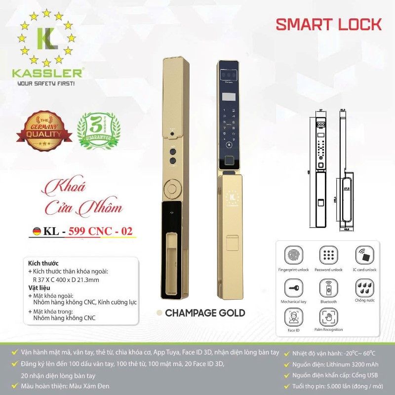 - Khóa Kassler KL-599 CNC 02 Champagne gold đăng ký tối đa được 20 khuôn mặt, 20 lòng bàn tay, 100 vân tay, 100 thẻ từ, 100 mã số. Có sẵn: 2 thẻ từ nhỏ, 2 chìa cơ