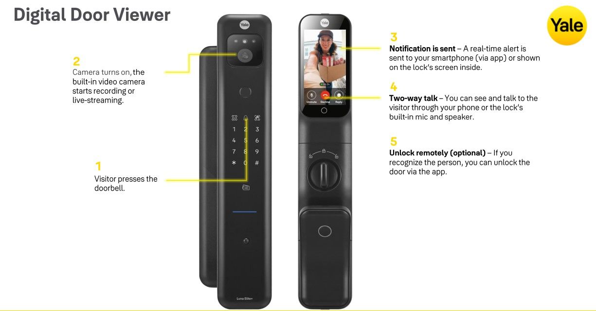 Yale Luna Elite+ có camera và màn hình tích hợp trực tiếp trên khoá, cho phép ghi hình, xem video trực tiếp và lưu trữ hình ảnh người ra vào.
