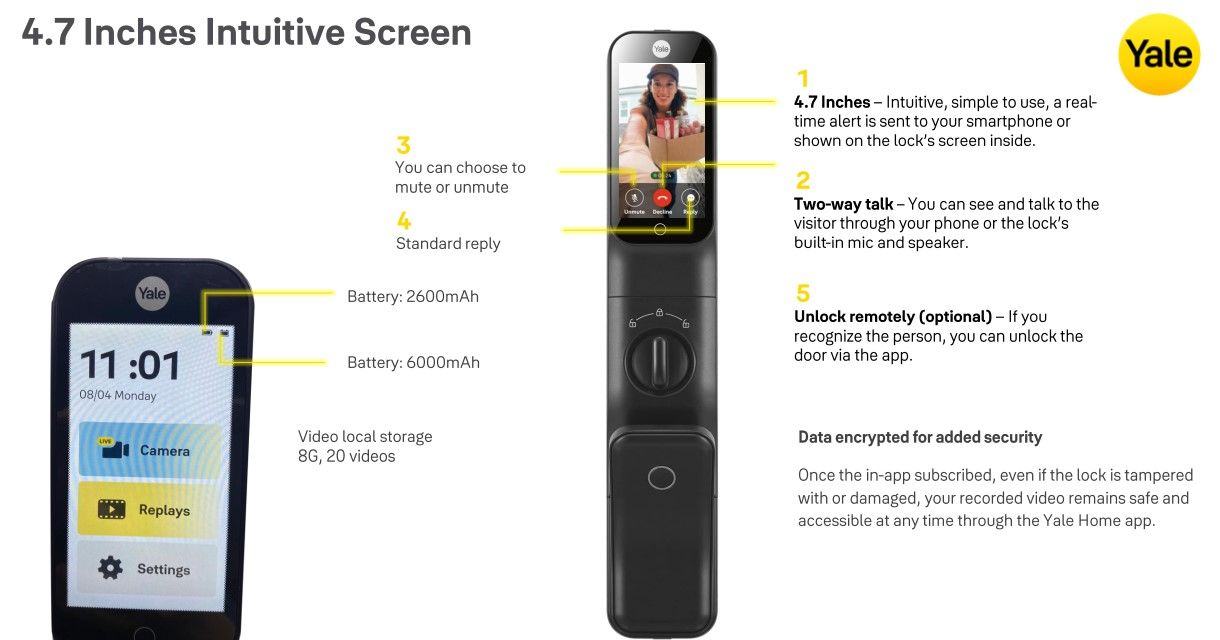 Khóa tích hợp sẵn kết nối wifi, bluetooth với mobile, cho phép điều khiển, giám sát và cấp quyền truy cập từ xa. Ngoài ra, khóa còn được trang bị camera và chuông cửa video, màn hình cảm ứng 4.7 inch giúp quan sát bên ngoài, trò chuyện qua video call, xem lại video người ghé thăm lưu trên khóa