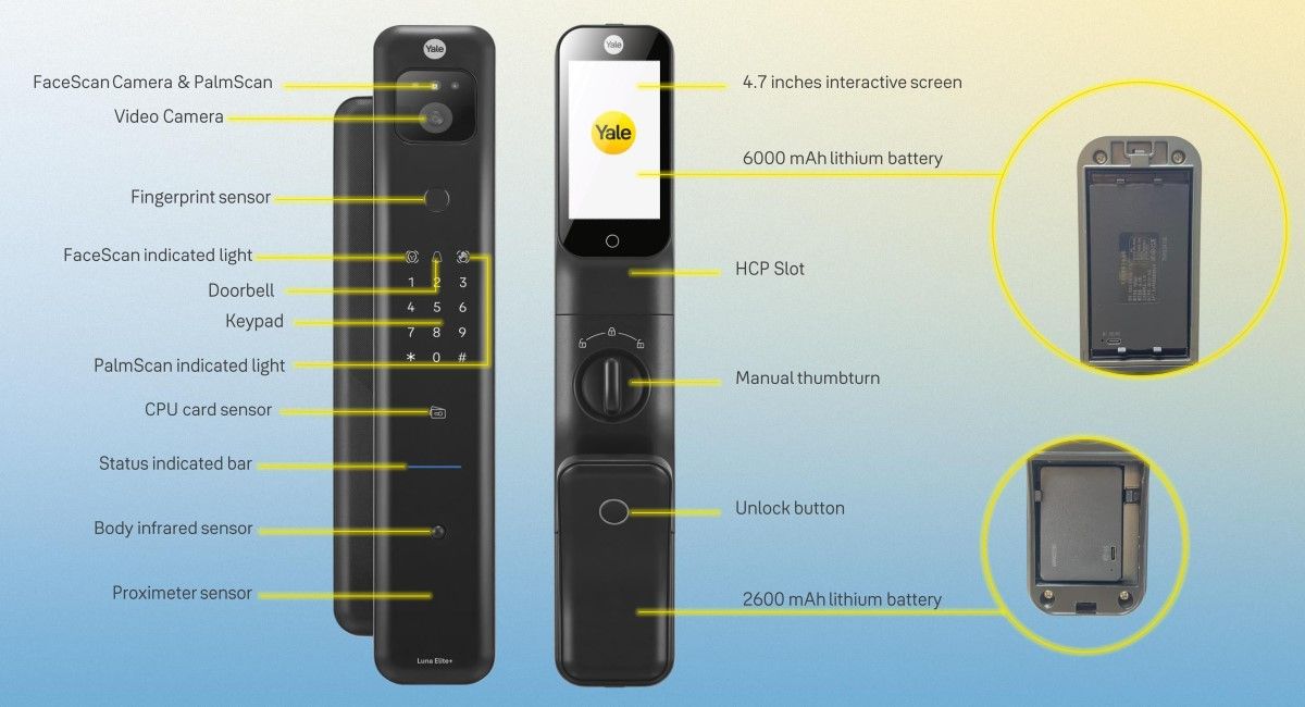 Sử dụng pin lithium kép thông minh (smart dual bettery) với 2 viên pin, khoá đảm bảo nguồn điện liên tục và an toàn tuyệt đối. Với thiết kế sang trọng, chất liệu cao cấp, đầy đủ tính năng, Yale Luna Elite+ là lựa chọn hoàn hảo cho biệt thự, căn hộ và văn phòng hiện đại – nơi an ninh và phong cách được đặt lên hàng đầu