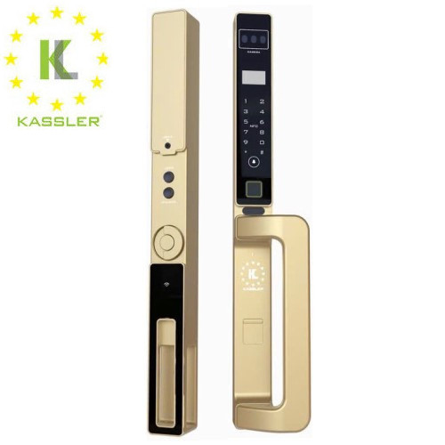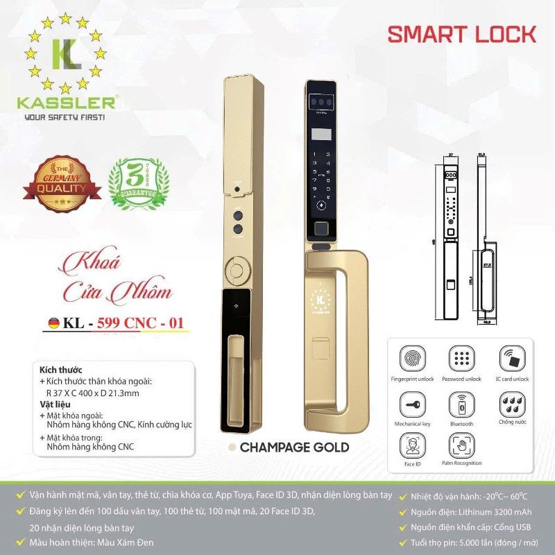 Kassler KL-599 CNC 01 Champagne gold có mở bằng: khuôn mặt, vân tay, lòng bàn tay, mã số, thẻ từ, chìa cơ, mobile app wifi Tuya.