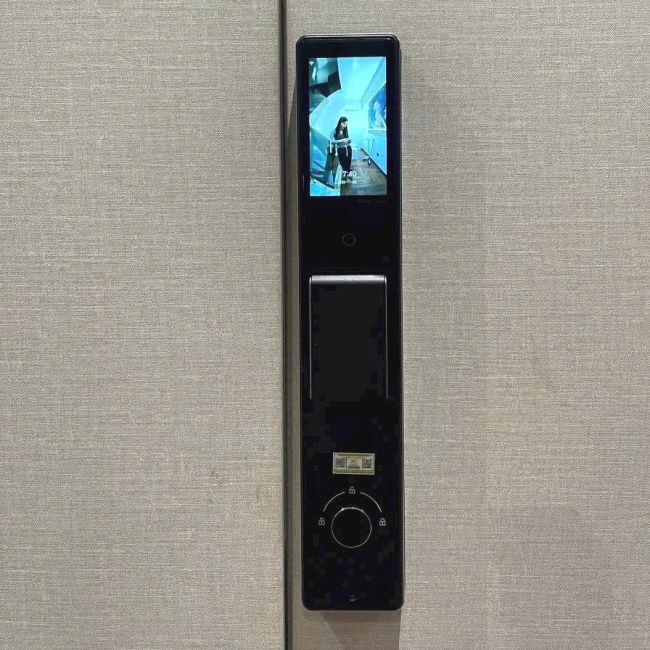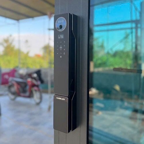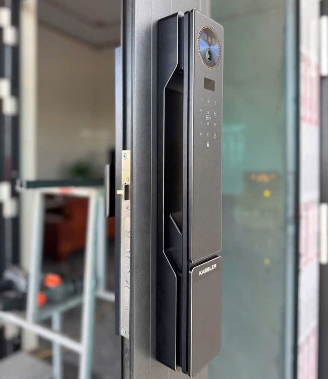 Khóa điện tử cao cấp cho cửa gỗ, cửa nhôm đố to. Có mở từ xa bằng bằng điện thoại và remote. Camera để video call