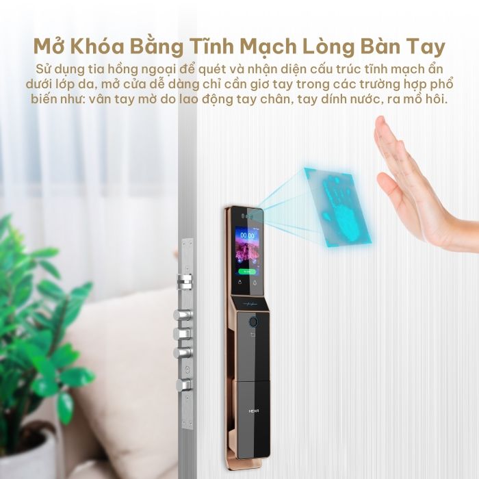 Khóa thông minh Hexa P100M-Promax Đồng đỏ được trang bị tính năng mở khóa bằng tĩnh mạch lòng bàn tay, mang đến trải nghiệm ra vào nhà tiện lợi và bảo mật mà không cần chạm. Công nghệ này sử dụng tia hồng ngoại để quét và nhận diện cấu trúc tĩnh mạch ẩn dưới lớp da - một đặc điểm sinh học hoàn toàn cá nhân, không thể sao chép hay làm giả. Nhờ đó, người dùng vẫn có thể mở cửa dễ dàng trong các trường hợp phổ biến như: vân tay mờ do lao động tay chân, tay dính nước, ra mồ hôi. Đây là giải pháp tối ưu cho gia đình có người lớn tuổi, trẻ nhỏ hoặc nhiều thành viên với nhu cầu mở khóa khác nhau.