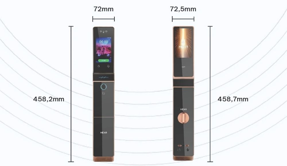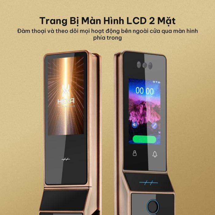 Khóa cửa thông minh Hexa P100M-Promax Đồng đỏ sở hữu màn hình LCD hai mặt tiện dụng, hiển thị rõ ràng các chỉ dẫn thao tác, cảnh báo, và trạng thái hoạt động của khóa. Thiết kế thông minh này giúp người dùng dễ dàng tương tác với khóa khi mở cửa, trong khi mặt trong cho phép cài đặt nhanh, kiểm tra dung lượng pin, xem lại lịch sử mở cửa và đặc biệt là hỗ trợ giao tiếp hai chiều. Điều này không chỉ tăng tính trực quan khi sử dụng mà còn nâng cao trải nghiệm an ninh thông minh cho cả gia đình.