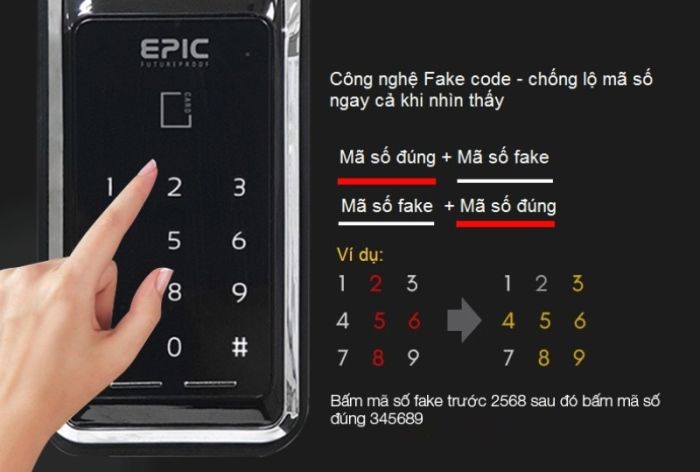 Khi sử dụng tính năng mã số ảo, người dùng sẽ tránh được việc bị lộ mã số ngay cả khi nhìn thấy. Cụ thể, khi nhập mã số để mở cửa người dùng có thể nhập 1 dãy số bất kỳ trước hoặc sau khi nhập mã số thật, khóa sẽ tự động nhận diện mã số thật và mở cửa như bình thường.