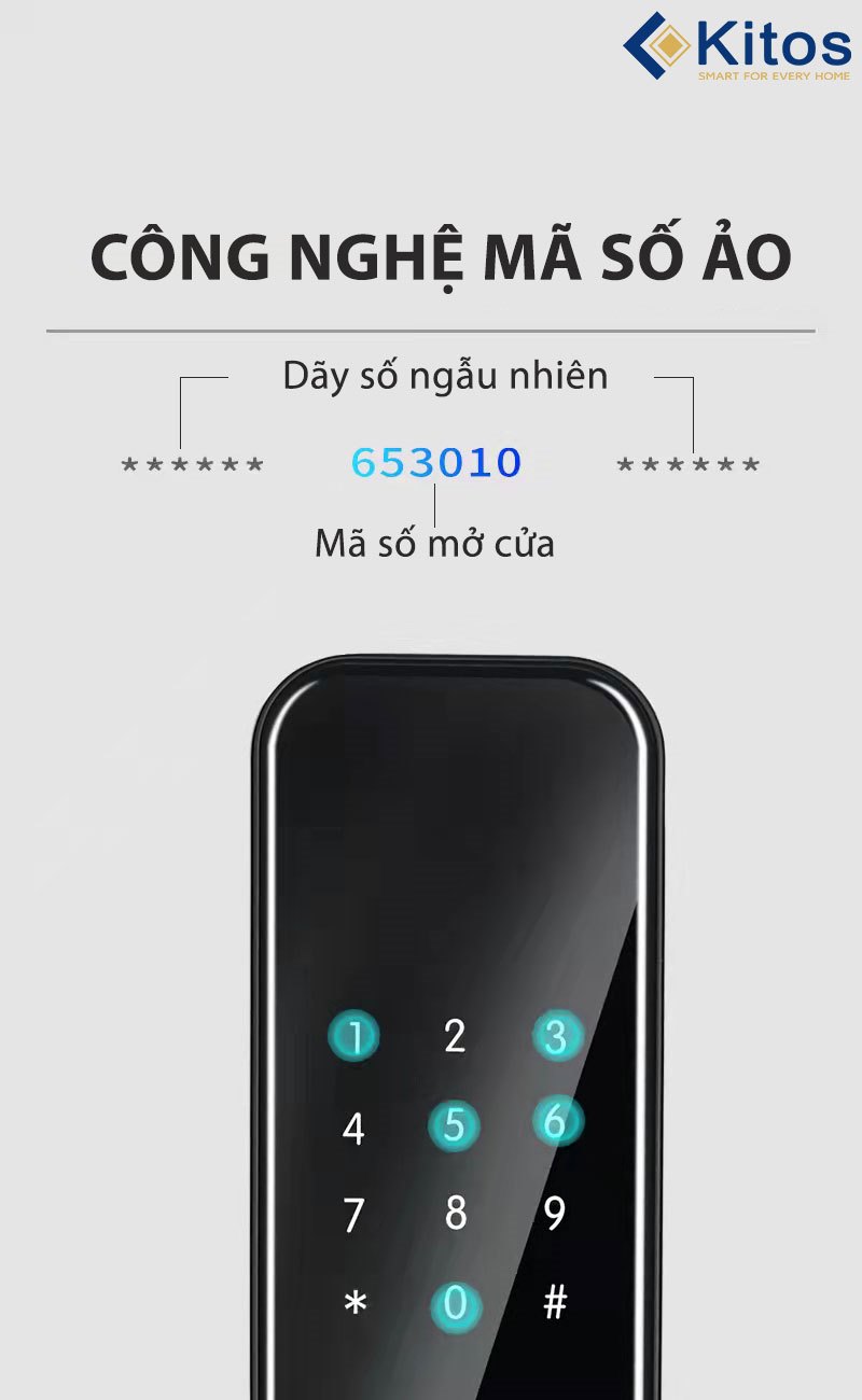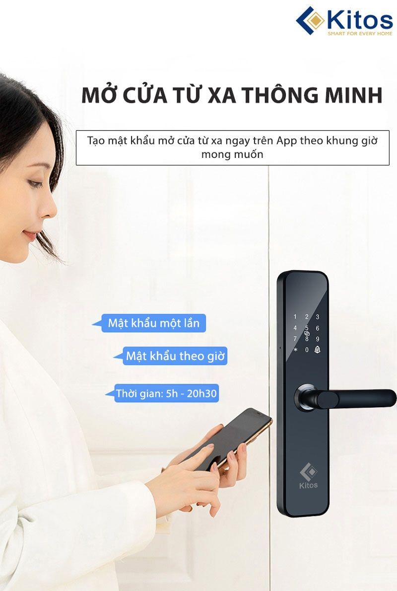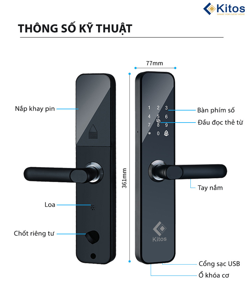 - Kitos KT-V1 có mở khóa bằng thẻ từ, mã số, chìa cơ, app bluetooth. Có sẵn: 2 thẻ từ nhỏ, 2 chìa cơ