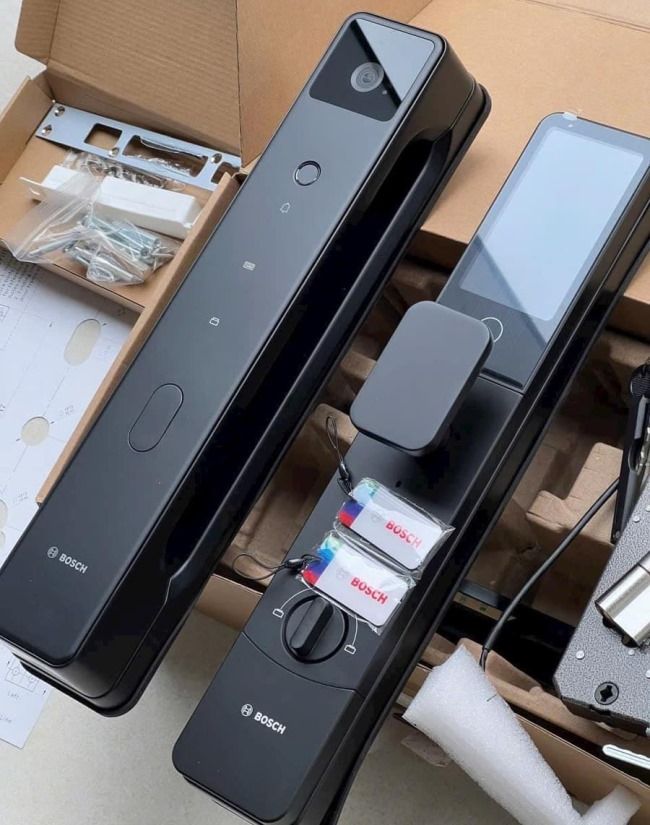 - Khoá Bosch FU8 Plus Black đăng ký tối đa được 20 khuôn mặt, 100 vân tay, 100 thẻ từ, 100 mã số người dùng (có mã số chủ để quản lý người dùng). Có sẵn: 2 thẻ từ nhỏ, 2 chìa cơ.