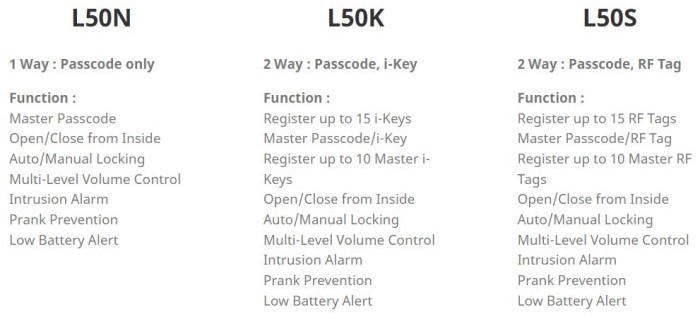 Locpro L50 có 3 loại. Mã L50N mở khóa bằng mã số; Mã L50K mở khóa bằng mã số và chìa điện tử; Mã L50S mở bằng mã số và thẻ từ