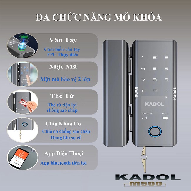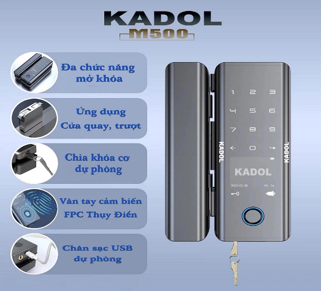 Kadol M500 là mã khóa điện tử cửa kính mới của hãng với kiểu dáng đẹp và nhiều tính năng ưu việt. Đặc biệt, khóa có cả mở bằng chìa khóa cơ để dự phòng khi cần