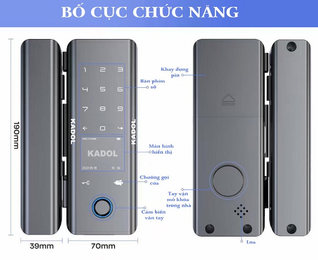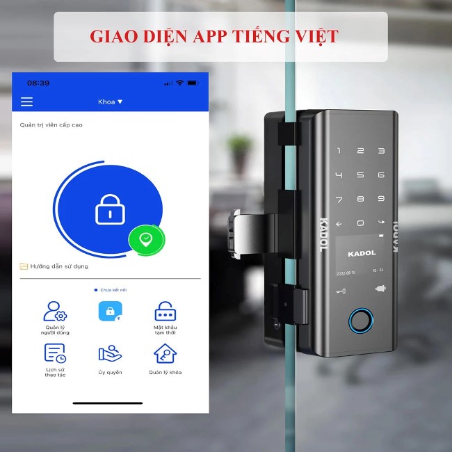 - Mở khóa bằng: vân tay, thẻ từ, mã số, chìa cơ, app bluetooth. Mở rộng: remote, app mobile qua wifi
