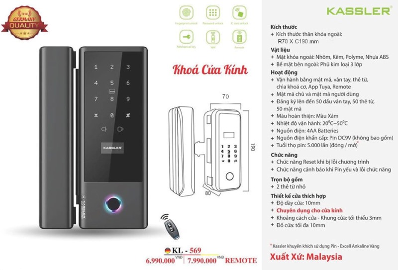 - Kassler KL-569 đăng ký tối đa được 50 vân tay, 50 thẻ từ, 50 mã số (có mã số chủ để quản lý người dùng). Có sẵn: 2 thẻ từ nhỏ, 2 chìa cơ. Có thể mua thêm remote