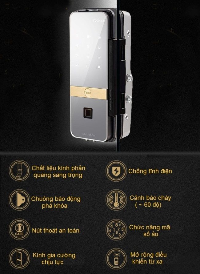 Yale YDG413A là khóa điện tử cửa kính cao cấp của Mỹ. Khóa có kiểu dáng hiện đại và sang trọng nhất hiện nay. Màn hình kính cường lực gương phản quang rất đẹp, đảm bảo chống xước, chống va đập, và luôn như mới