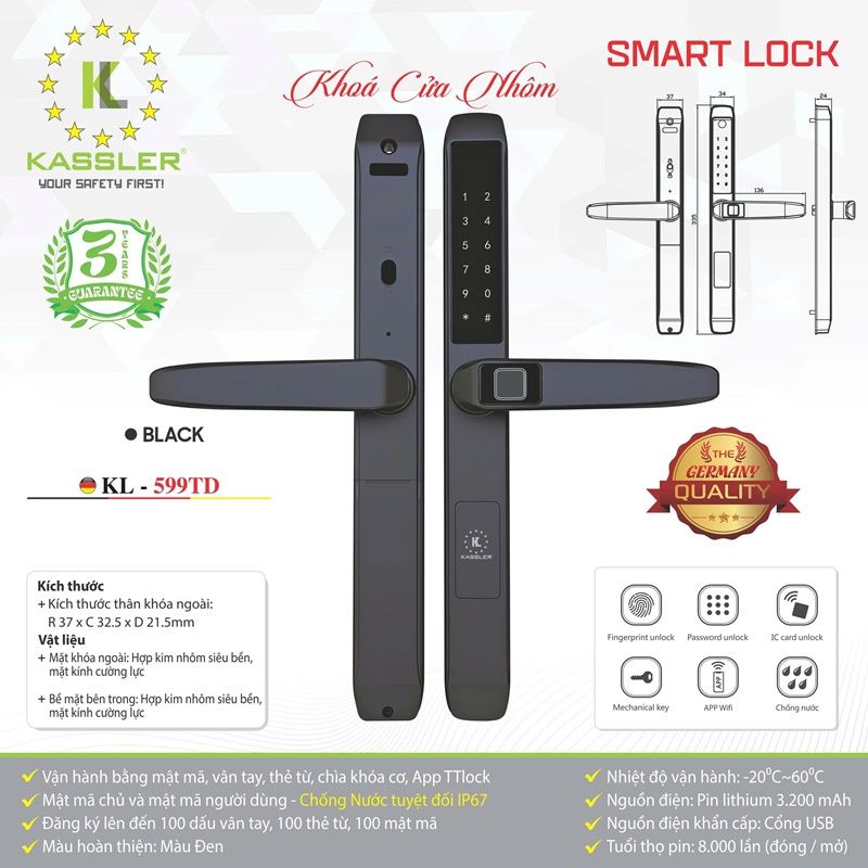 Kassler KL-599TD black có mở bằng: vân tay, mã số, thẻ từ, chìa khóa chống sao chép, và mobile app TTLock.