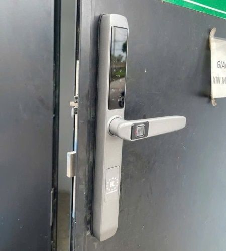 Khóa điện tử cửa nhôm, có mở bằng điện thoại. Chống chịu được nước mưa. Màu xám