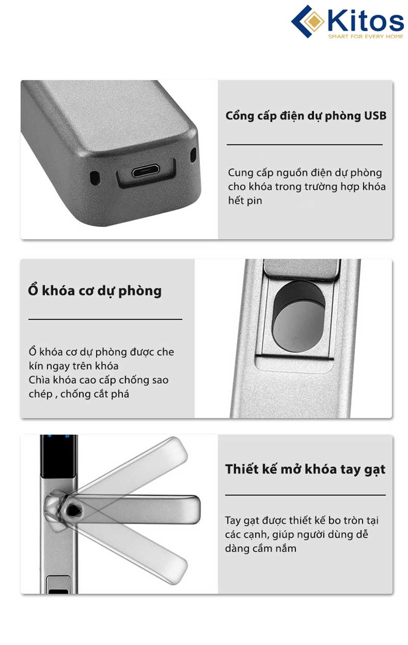 Trên tay nắm của Kitos KT-AL650 Plus được thiết kế một nắp trượt để che đi vị trí đặt vân tay. Điều này giúp bảo vệ cho đầu đọc vân tay không bị tác động bởi các yếu tố ngoại quan như mưa, bụi…