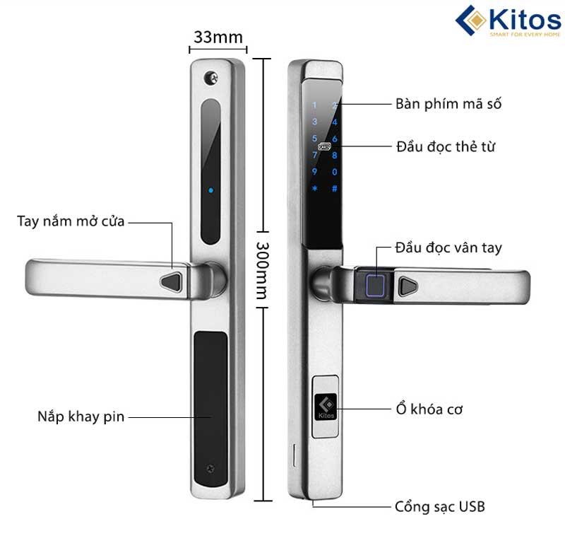 - Kitos KT-AL650 Plus đăng ký tối đa được 300 vân tay, thẻ từ, mã số. Có sẵn: 2 thẻ từ nhỏ, 2 chìa cơ. Có thể mua thêm để dùng remote giá 500 nghìn