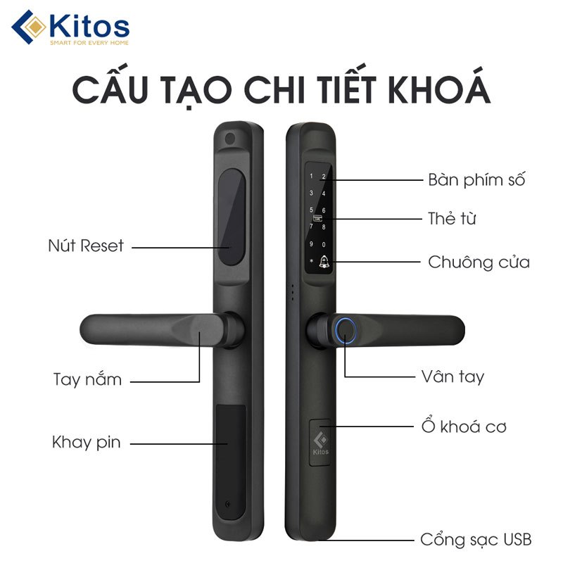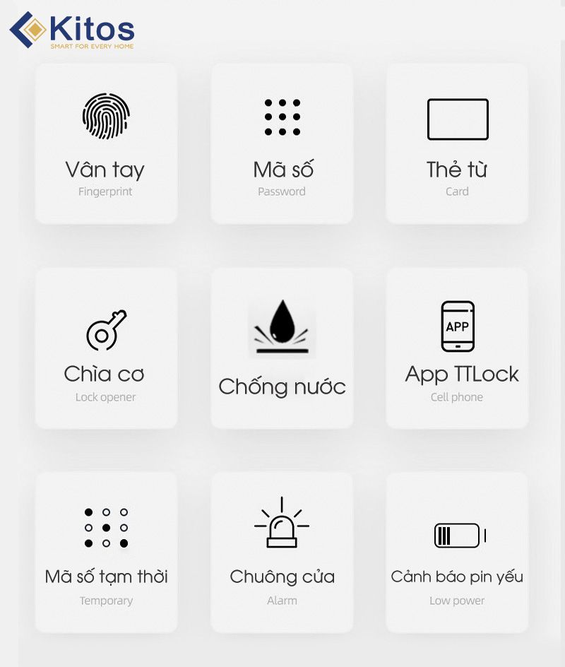 - Khóa Kitos KT ALX5 Pro đăng ký tối đa được 100 vân tay, 100 thẻ từ, 100 mã số. Có sẵn: 2 thẻ từ nhỏ, 2 chìa cơ. Có thể mua thêm remote để đóng mở từ xa, hoặc mua thêm gateway để dùng mobile app qua wifi/ 4G