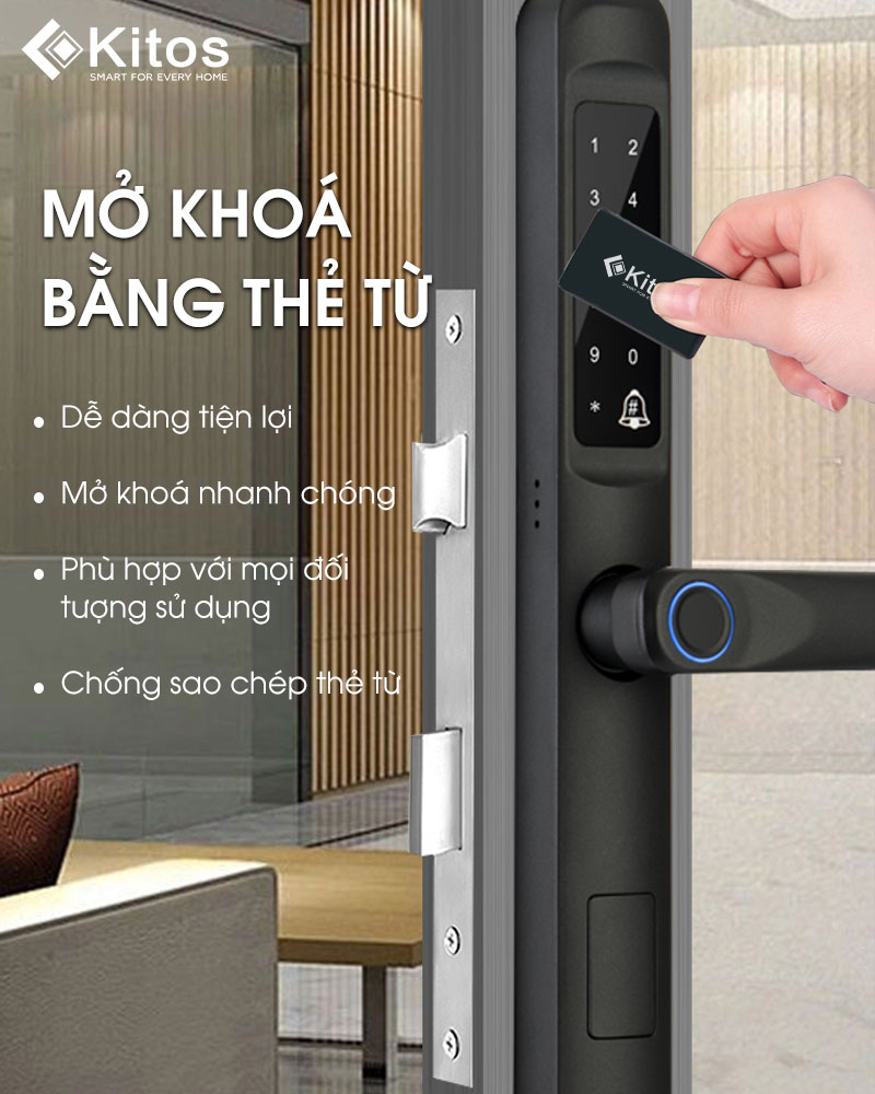 - Mở bằng: vân tay, thẻ từ, mã số, chìa cơ, mobile app bluetooth TTLock. Mở rộng: remote, app wifi