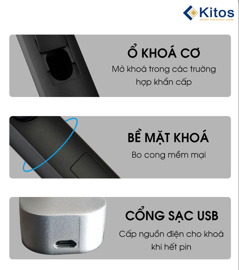 Với cổng sạc USB dự phòng, nếu để hết khóa Kitos ALX5 Pro hết pin, bạn chỉ cần kết nối với pin sạc dự phòng là có thể cấp nguồn tạm thời để mở khóa ngay lập tức. Ngoài ra, khóa có chức năng cảnh báo pin yếu, giúp bạn chủ động thay pin kịp thời