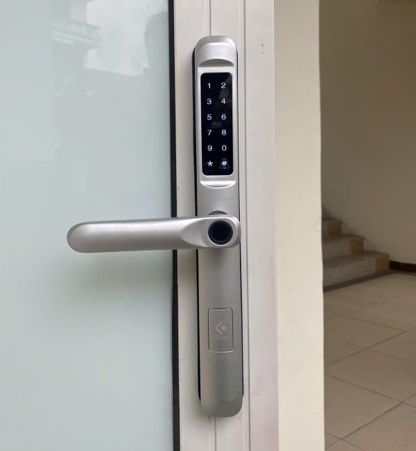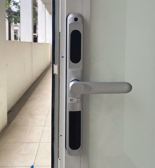 Khóa điện tử cửa nhôm có mở từ xa, chống nước. Có 2 màu là đen và bạc