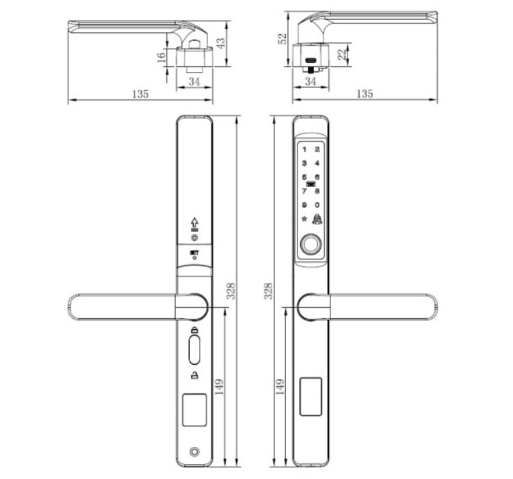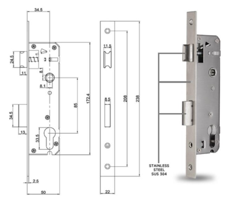 - Kích thước thân khóa ngoài (Rx Cx S): 34x 328x 22 mm