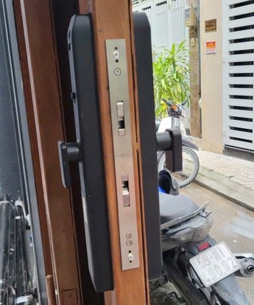 Khóa điện tử cửa nhôm, có mở bằng điện thoại. Chống được nước mưa. Màu đen