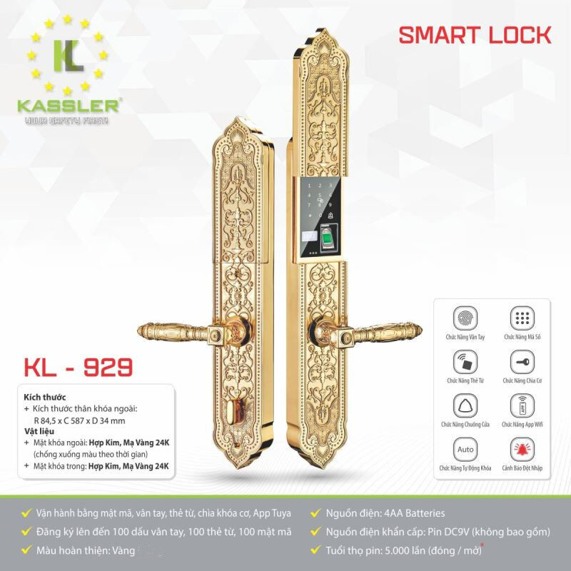 Kassler KL-929 là dòng khóa vân tay cao cấp với kiểu dáng sang trọng, dành cho những bộ cửa đại sảnh, cửa biệt thự