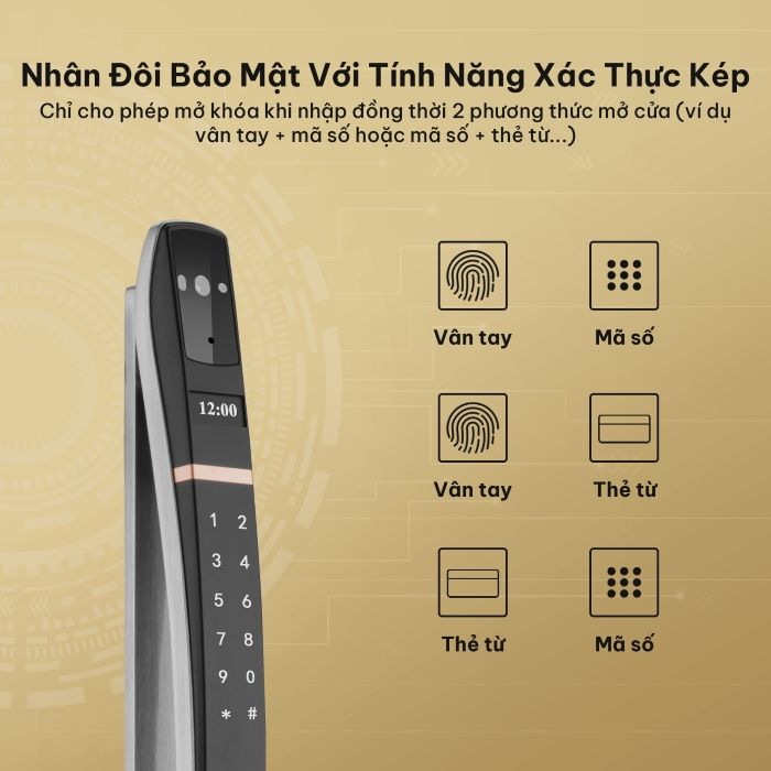 Bạn có thể cài đặt chế độ mở khóa kép như: vân tay + mã số, hoặc vân tay + thẻ từ. Tính năng này đặc biệt hữu ích cho các vị trí cần sự bảo mật cao như cửa chính, phòng làm việc cá nhân, phòng tài liệu...