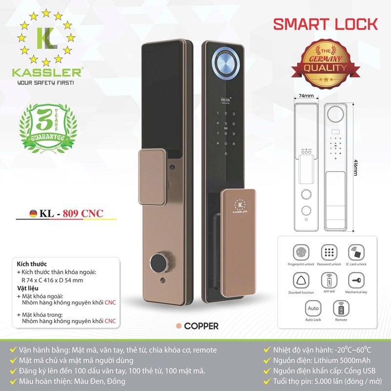 - Khoá Kassler KL-809 CNC Copper đăng ký được tối đa 100 vân tay, 100 thẻ từ, 100 mã số. Có sẵn: 2 thẻ từ nhỏ, 2 chìa cơ chống sao chép