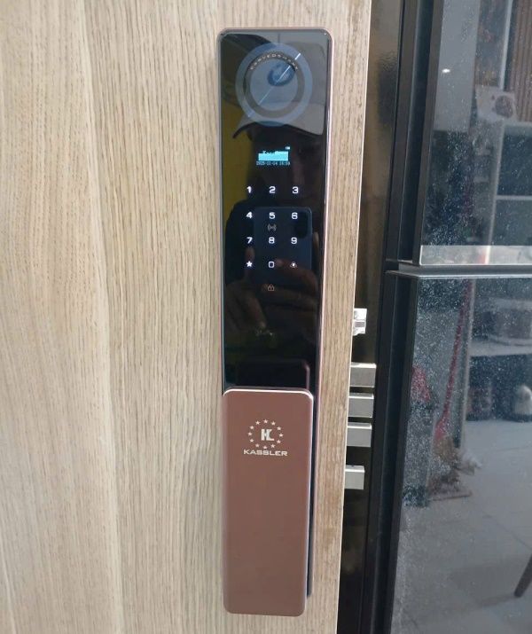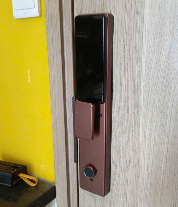 Khóa vân tay cho cửa gỗ, cửa nhôm đố to. Có mở từ xa bằng bằng điện thoại. Màu đồng đỏ đậm