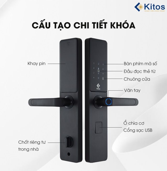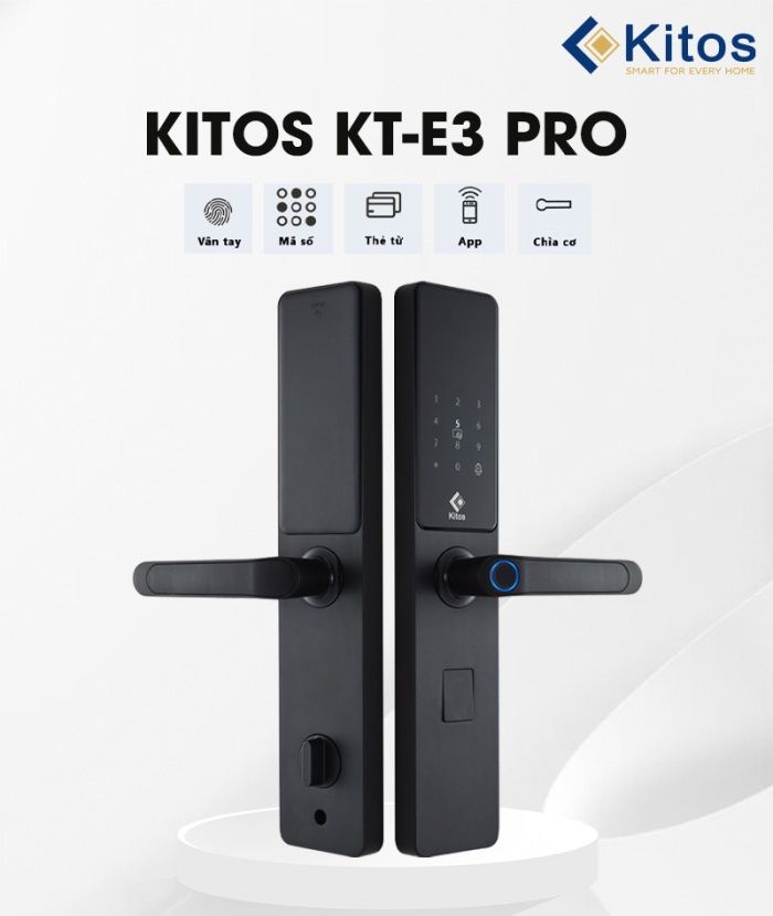 - Khóa Kitos KT-E3 Pro Đồng đăng ký tối đa được 100 vân tay, 100 thẻ từ, 100 mã số. Có thể mua thêm remote để đóng mở từ xa. Có sẵn: 2 thẻ từ nhỏ, 2 chìa cơ