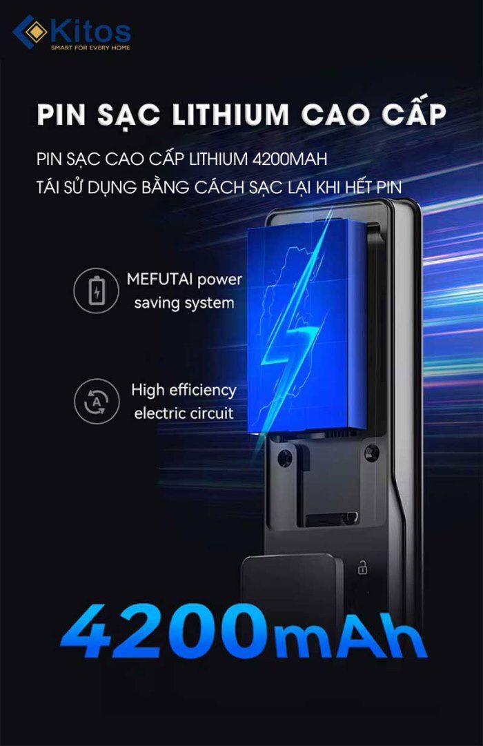 Với dung lượng pin 4200mAh, khóa có thể hoạt động lên đến 6 tháng và có thể tái sử dụng bằng cách sạc lại.