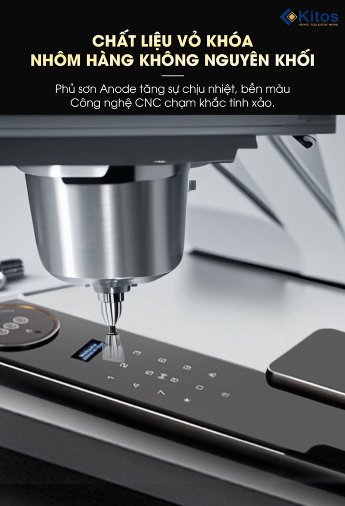 So với các chất liệu hợp kim thông thường, khóa Kitos KT X8 được làm từ chất liệu nhôm hàng không nguyên khối với công nghệ CNC tinh xảo, các chi tiết được chạm khắc sắc nét. Cộng thêm với lớp sơn phủ Anode bên ngoài tăng tính chịu nhiệt giúp cho lớp vỏ khóa trở nên bền bỉ, bền màu theo năm tháng.