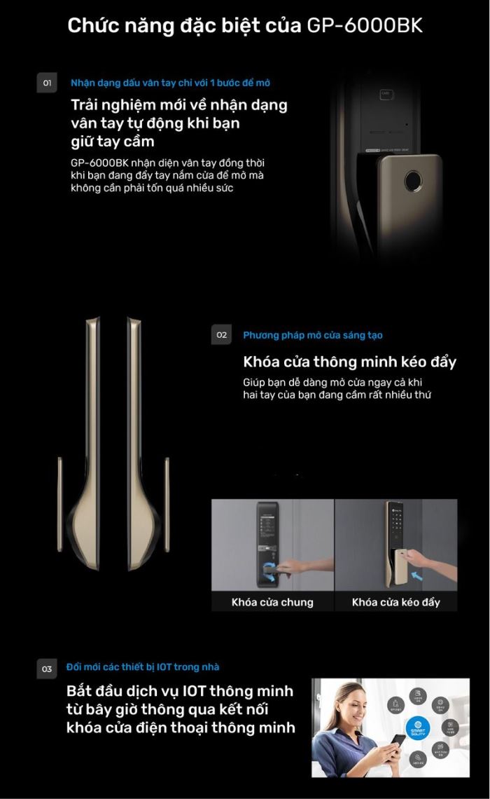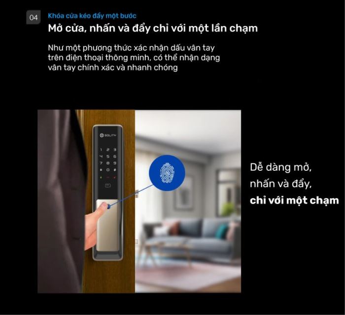 - Solity GP-6000BK có đa dạng phương thức mở khóa: vân tay, thẻ từ, mã số, chìa cơ, app mobile qua wifi. Với mobile app Solity gia chủ có thể mở và quản lý khóa từ xa (mở khóa hoặc trao quyền mở khóa cho người khác từ bất kỳ đâu, xem lịch sử đóng mở khóa của người dùng)