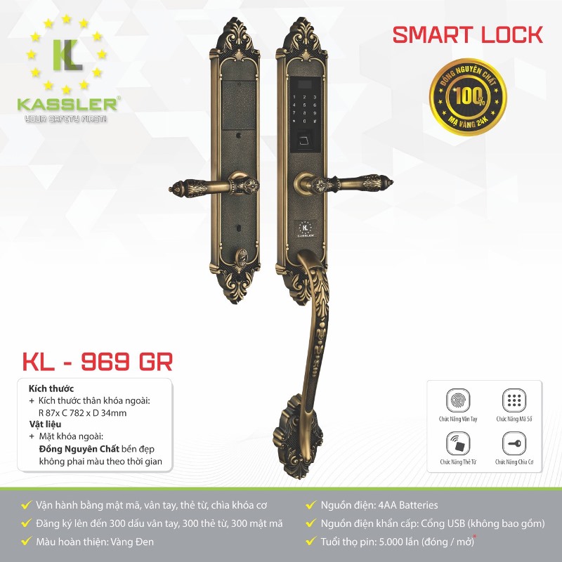 - Kassler KL-969 GR đăng ký được 300 vân tay, 300 thẻ từ, 300 mã số (1 mã số chủ để quản lý và 299 mã số người dùng). Có sẵn: 2 thẻ từ nhỏ, 2 chìa cơ