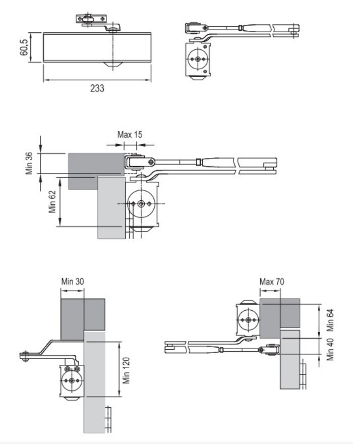 - Lực đẩy (power): size EN 2, 3, 4, 5 (tùy chỉnh lực đẩy theo độ rộng của cửa. EN 2 ≤ 850mm; EN 3 ≤ 950mm; EN 4 ≤ 1100mm; EN 5 ≤ 1250mm)