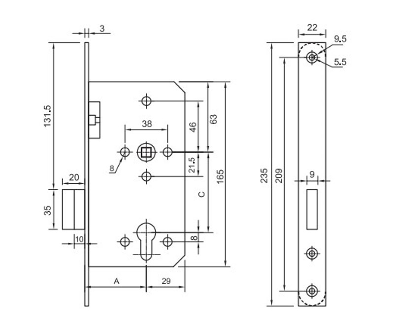- Khoảng cách từ mép cửa đến tâm ruột khóa (backset): 55mm