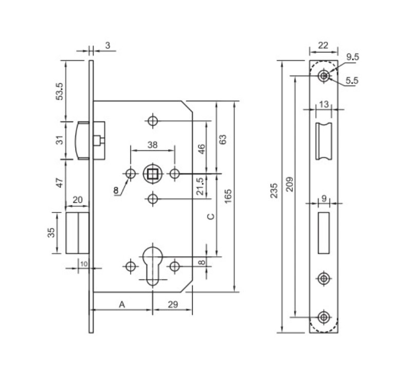 - Khoảng cách từ mép cửa đến tâm ruột khóa (backset): 55mm