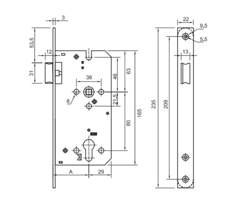 - Khoảng cách từ mép cửa đến tâm tay gạt (backset): 55mm